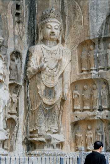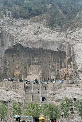 The most remarkable part of the Longmen Grottoes is the large Buddha ensemble, which was formerly hidden by a wooden shrine.