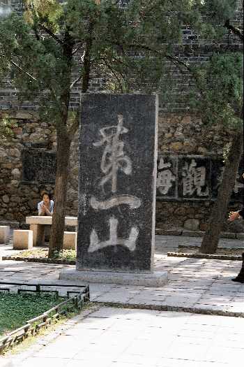 Having arrived at Tai'an at 6 a.m., we first stayed at a hotel to refresh ourselves. At 10 a.m. we went to the first Buddhist monastery, which should not be a great surprise. The inscription on the stele at the bottom left means "First Mountain", referring to Taishan as one of the most important among the Chinese holy mountains.