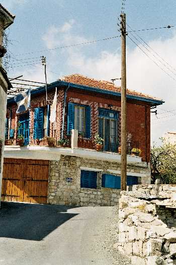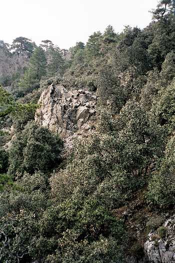 The quite beautiful church of Platres, which has been built directly at the rim of the Cold River gorge. Seen from the gorge. A close up gives a clearer picture.