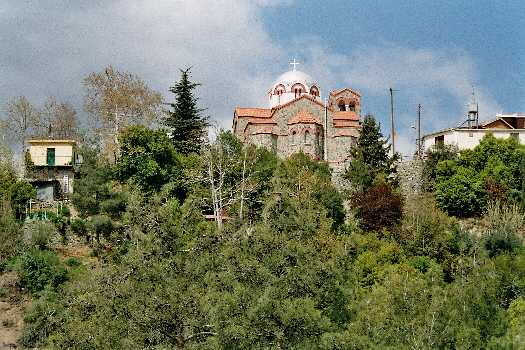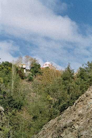 The quite beautiful church of Platres, which has been built directly at the rim of the Cold River gorge. Seen from the gorge. A close up gives a clearer picture.